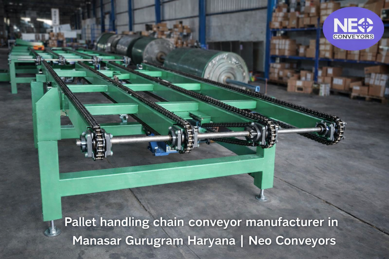 Neo Conveyors is a trusted pallet handling chain conveyor manufacturer in Manesar, Gurugram, Haryana, offering robust and high-load conveyor solutions for automotive, FMCG, logistics, packaging, and manufacturing industries.