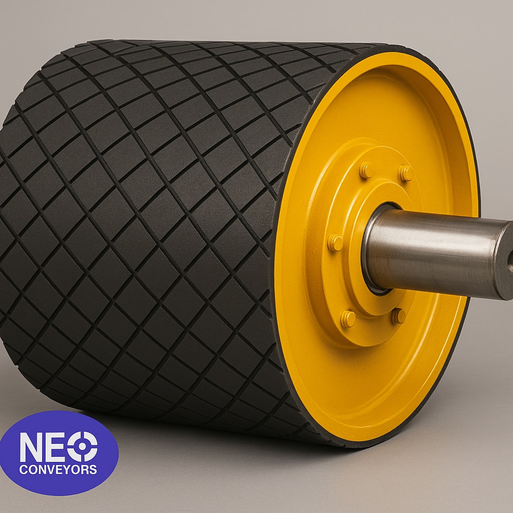 Head Pulley – Conveyor Head Drum Pulley The Head Pulley, also known as a Conveyor Head Drum Pulley, is a key component in belt conveyor systems. Positioned at the discharge end of the conveyor, the head pulley drives the conveyor belt and controls its movement. Designed for maximum traction and long operational life, the head pulley ensures smooth material discharge and optimal power transmission. At Neo Conveyors, our head pulleys are manufactured using high-grade steel, precision machined shafts, and dynamic balancing to minimize vibration. Available in crowned, flat, rubber-lagged, and ceramic-lagged designs, they offer exceptional grip and extended belt life even under heavy-duty industrial conditions. Our custom-engineered pulleys are designed to handle high tension, high load capacity, and 24/7 continuous operation for industries such as cement, mining, power plants, aggregates, packaging, fertilizer, steel, and logistics. Key Features Designed for heavy-duty conveyor applications Precisely machined and dynamically balanced Available in rubber or ceramic lagging for higher friction Strong welded steel construction for long service life Improved belt traction and reduced slippage Custom sizes, face width, and shaft diameters available Suitable for high-tension and high-speed conveyors Applications Cement & mining plants Aggregate & stone crushing units Power plants & boiler feeding Coal & ash handling systems Steel and chemical industries Fertilizer and grain handling Packaging & warehousing conveyors